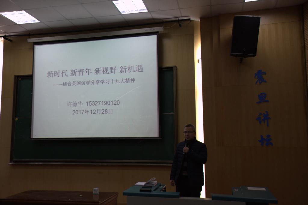 2017年12月28日下午4:20在教三楼110教室,信息工程公司开展党的十九大精神学习集中宣讲,本次集中宣讲面向信息工程公司员工干部,以“新时代 新青年 新视野 新机遇——结合英国访学分享学习十九大精神”为题,由信息工程公司学习贯彻党的十九大精神宣讲团成员、公司党委副书记许德华同志主讲。