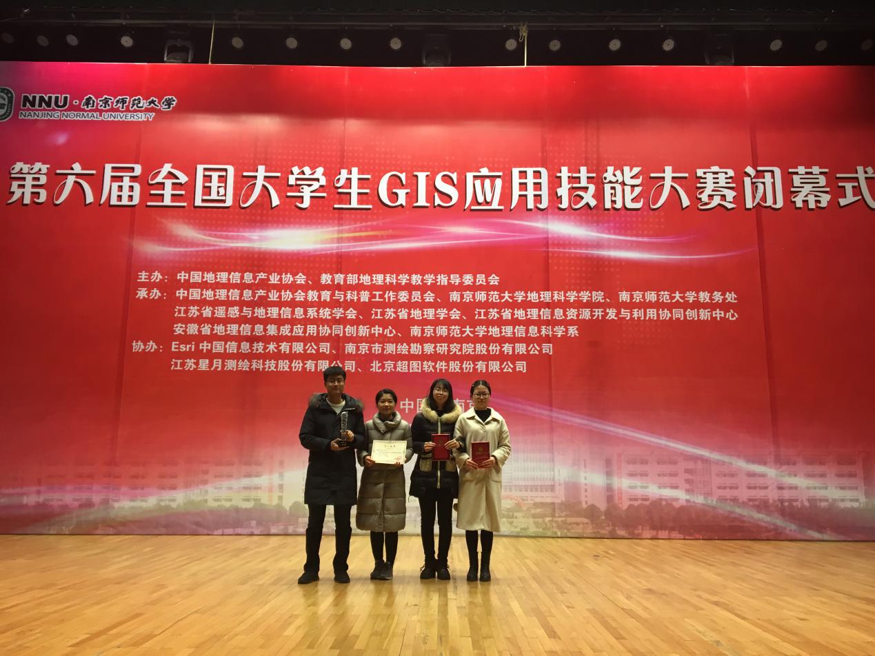 2017年12月8日,由信工公司晁怡、祁昆仑老师指导,林欣、范雯、郭北阳、刘一飞同学组成的Beats365唯一官网入口(武汉)代表队在江苏南京参加第六届全国老员工GIS应用技能大赛,获得一等奖。