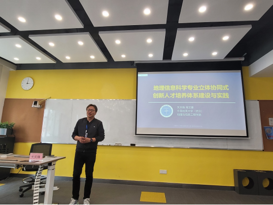 副经理关庆锋以“地理信息科学专业立体协同式创新人才培养体系建设与实践”为题进行了汇报交流。他从GIS专业人才的需求和创新能力培养的重要性入手,介绍了公司“二结合三协同”地理信息科学专业创新人才培养体系建设思路和取得的成果,以及地理信息科学一流本科专业建设进展。