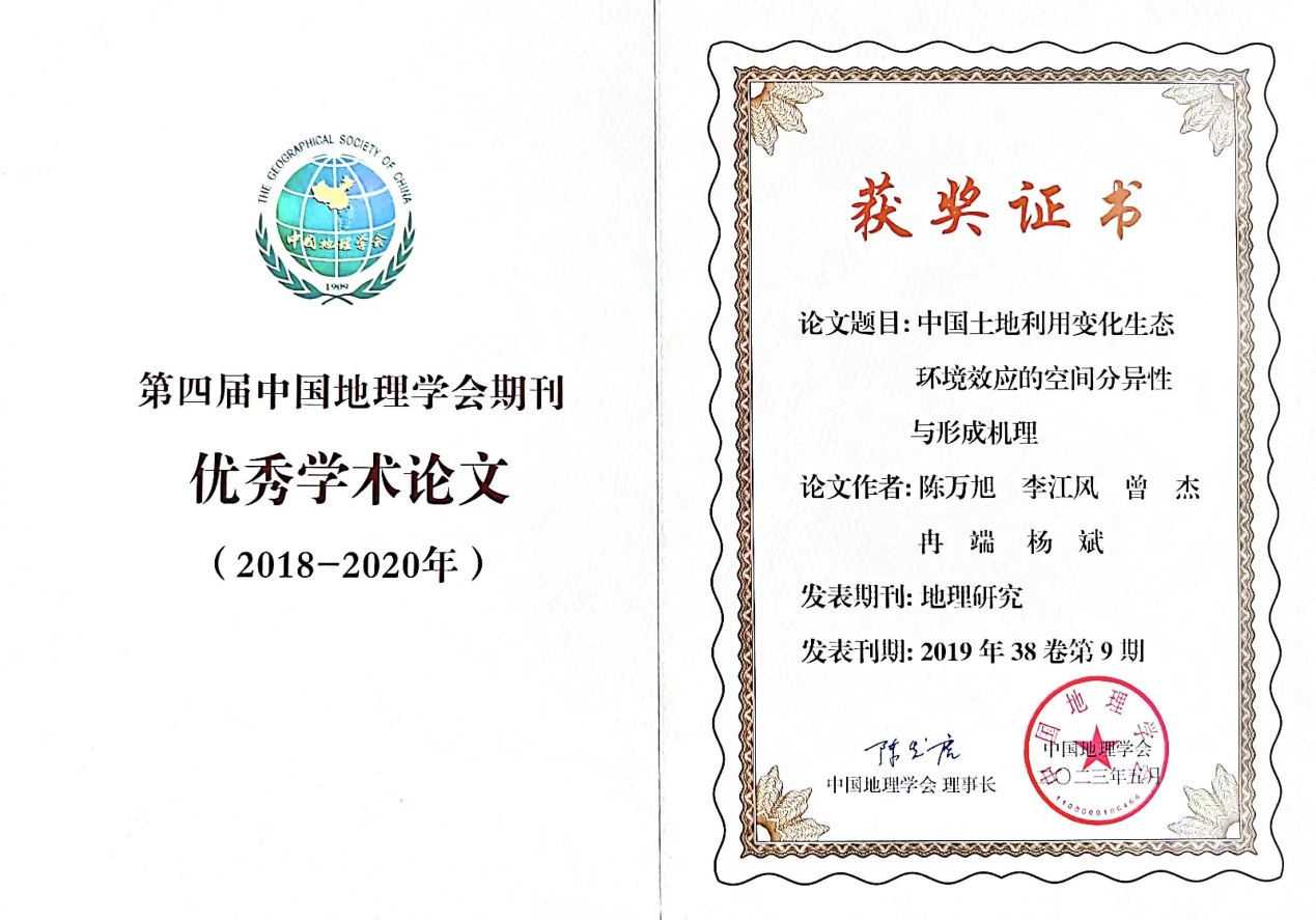 期间,第四届中国地理学会优秀学术论文(2018-2020)隆重发布,并举行颁奖仪式。50篇发表于2018‒2020年度的优秀学术论文从同期发表的8800余篇地理学类学术论文中脱颖而出。公司陈万旭副教授等撰写的《中国土地利用变化生态环境效应的空间分异性与形成机理》(地理研究,2019年第九期)荣获殊荣。
