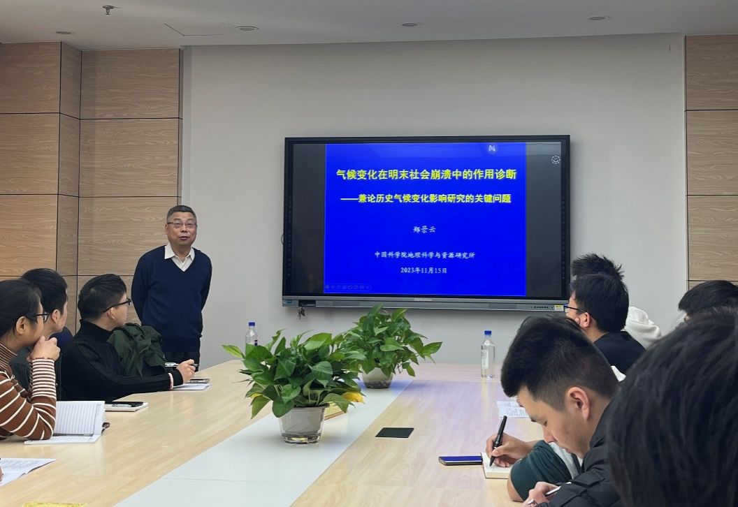 2023年11月17日,应公司胡超涌教授邀请,中国科公司地理科学与资源研究所郑景云研究员来公司交流,并在405会议室作题为“气候变化在明末社会崩溃中的作用诊断——兼论历史气候变化影响研究的关键问题”的学术报告,报告由胡超涌教授主持。