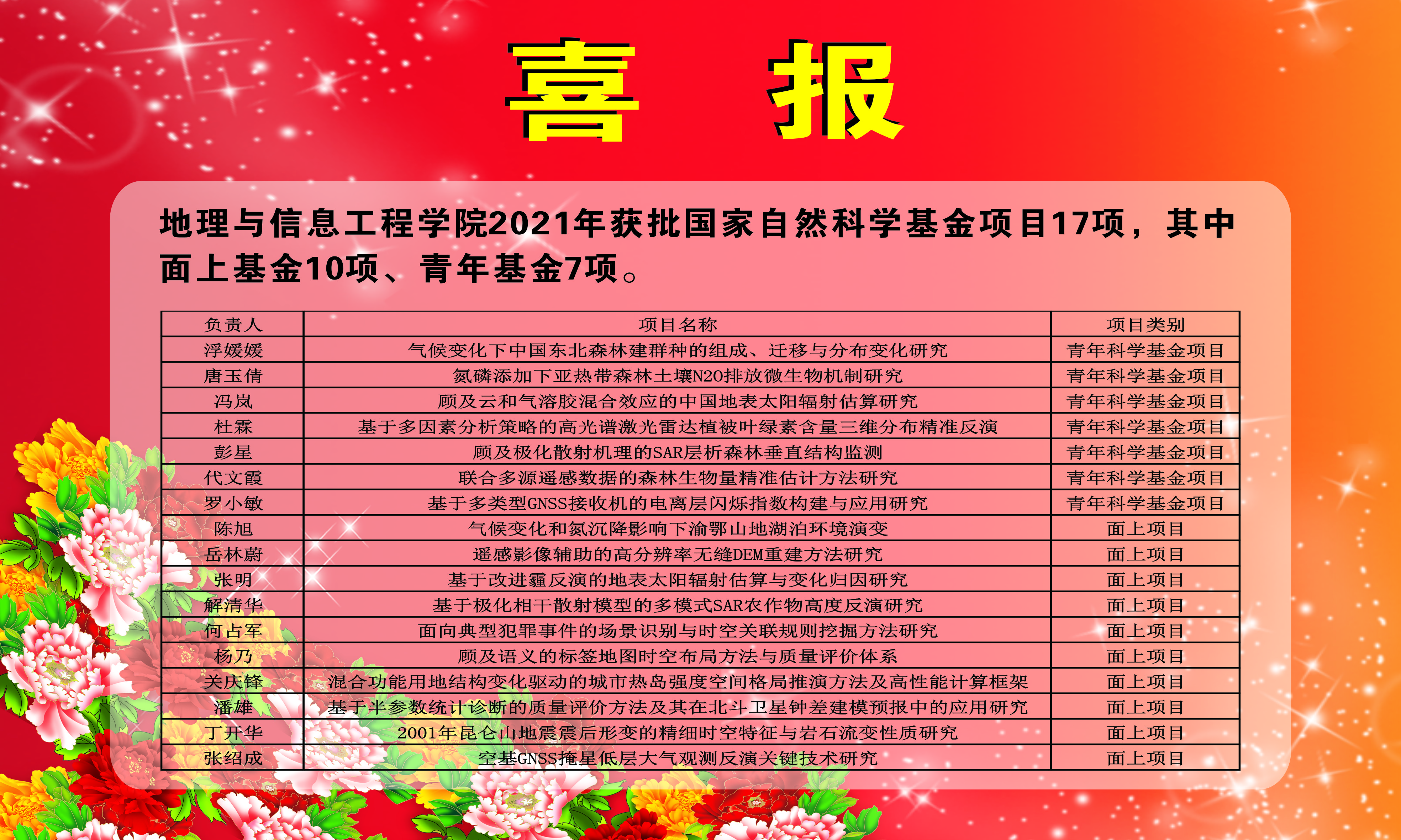 近日国家自然科学基金委员会公布了2021年度国家自然科学基金申请项目评审结果。公司共获批国家自然科学基金17项,其中面上项目10项,青年项目7项。在此,特向获得资助的项目负责人表示祝贺!