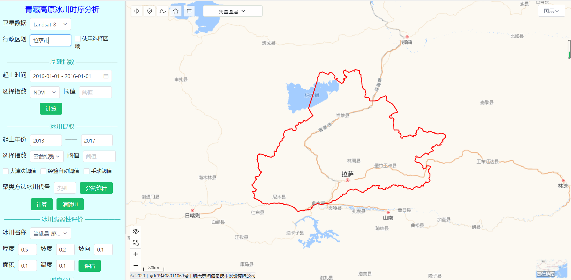 大赛从2021年1月份启动,9月底举行决赛,这9个月的时间里,胡肖小组的同学们精心打磨出了一份优秀的作品《多源数据青藏高原冰川提取分析平台》,本系统联合多源卫星数据研究青藏高原近15年来冰川面积变化,基于PIE Engine云平台利用Landsat,哨兵,高分等卫星数据计算冰川面积,结合Modis温度数据,降水数据和地形数据对青藏高原冰川的面积变化与年均温度、降水变化的相关性进行分析并对冰川的脆弱性进行分析。系统采用网页开发,采用了JAVA Script编程语言,依托于PIE Engine云平台进行界面设计与程序开发。