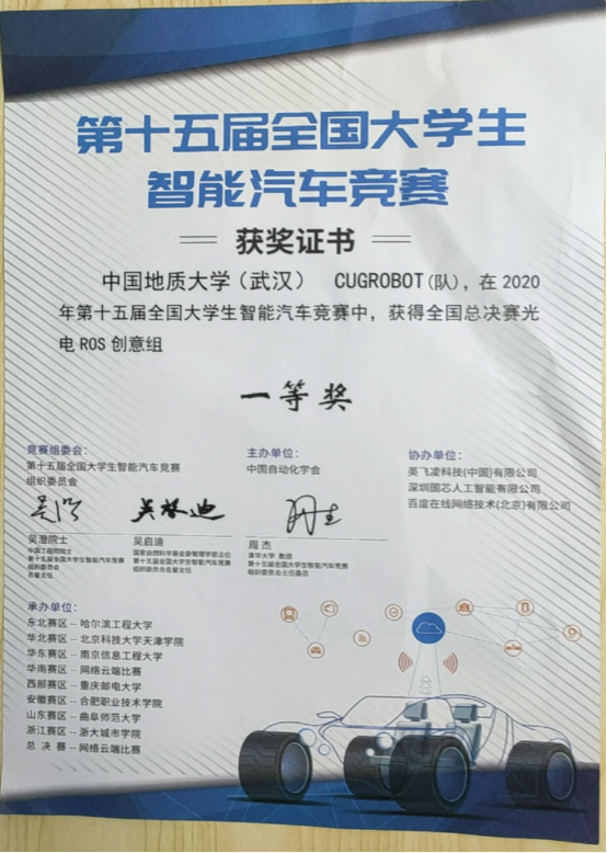 2020年8月23日至26日,第十五届全国老员工智能汽车竞赛创意组总决赛在南京信息工程大学举行,由Beats365唯一官网入口员工组成的CUGROBOT团队(队员:莫惠南、江严钊、舒鹏杰、郑剑宇、李子宇,指导老师:罗忠文、刘袁缘)参加了创意ROS组的全国总决赛,获得全国一等奖。