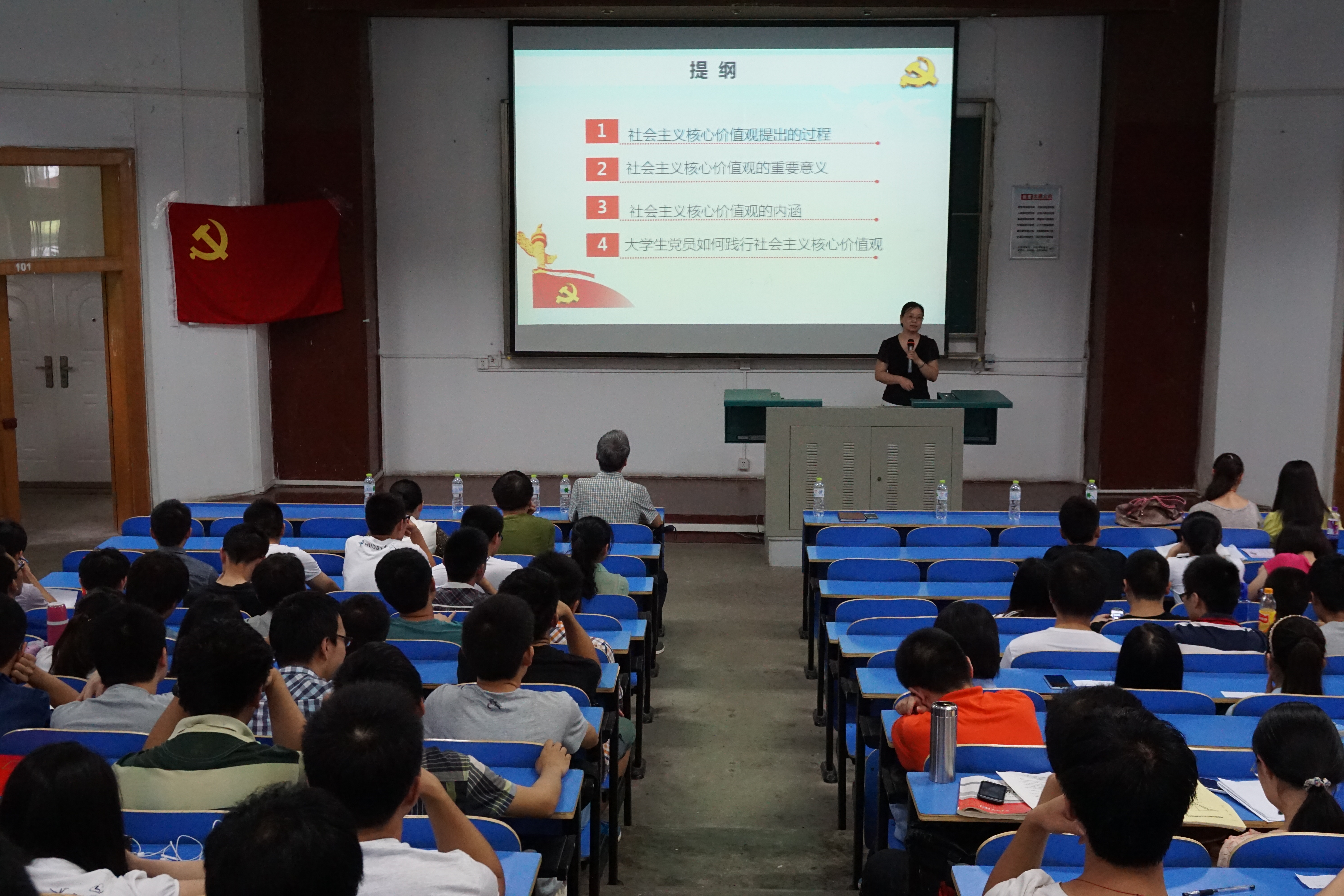 黄老师的报告从四个方面展开:一是社会主义核心价值观提出的过程,二是社会主义核心价值观的重要意义,三是社会主义核心价值观的内涵,四是老员工党员如何践行社会主义核心价值观。