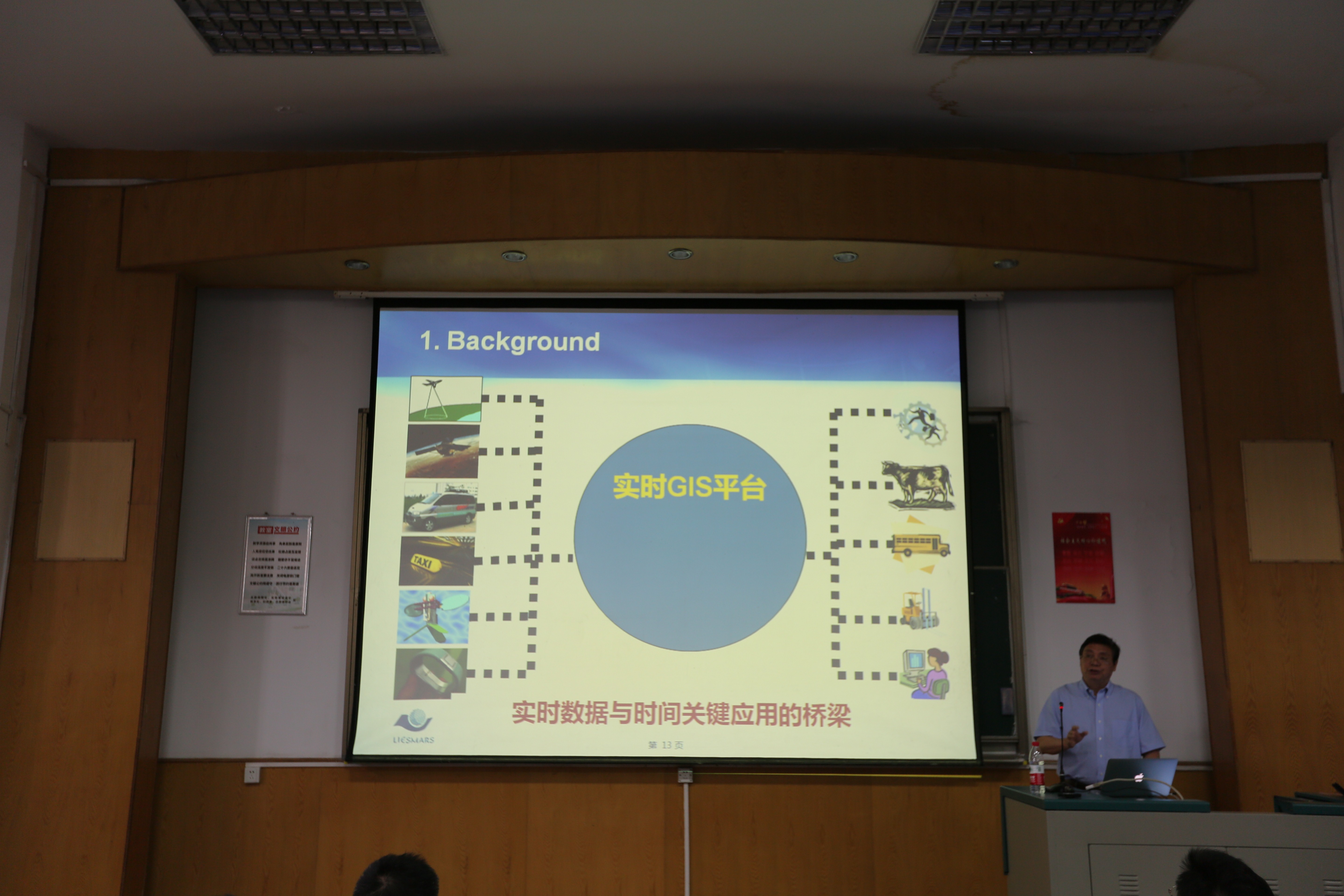 报告还没开始,教室里已座无虚席。四点整,谢忠经理简单介绍龚健雅院士后,讲座正式开始。龚院士从背景、实时GIS的主要特征、实时GIS的研究进展、实时GIS的应用以及结论展开。
