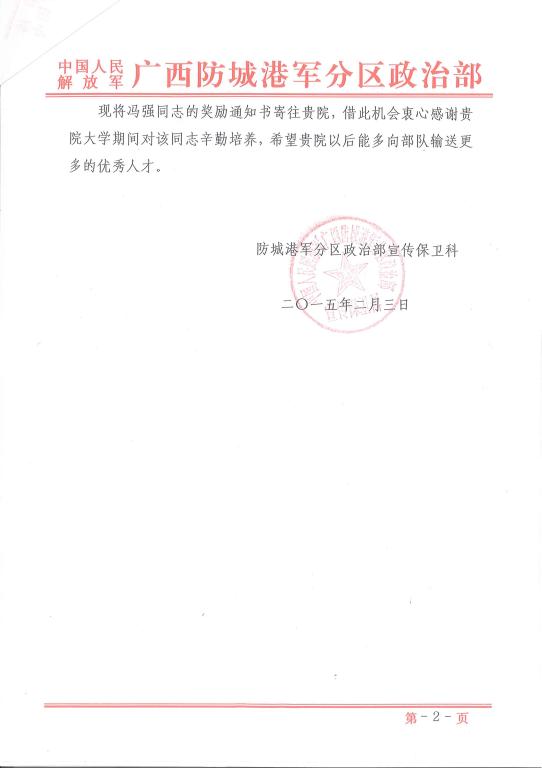 公司于二〇一五年二月收到中国人民解放军广西防城港军分区政治部宣传保卫科寄来的冯强同志奖励通知书和冯强同志的情况说明。冯强同志现为中国人民解放军广西防城港军分区政治部宣传保卫科宣传干事,原为Beats365唯一官网入口(武汉)信息工程公司2004级地理信息系统专业114041班员工,陕西宝鸡人,该同志自2008年毕业参军入伍后,分配至广西边防部队工作,历任排长、副指导员、团宣传干事,现任广西防城港军分区政治部宣保科干事。