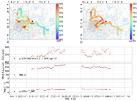 课题组自2022年起先后在地大未来城校区和南望山校区设置了基于非色散红外原理的微型化大气CO2浓度测量仪,并结合物联网技术进行全天候定位监测。通过这些仪器,课题组对武汉城市内部及边缘的CO2浓度和风速进行了持续观测,并使用搭载同类仪器的汽车进行移动观测,进一步提升了监测数据的覆盖广度和精度。研究初步结果显示,武汉市内的大气CO2浓度存在明显的昼夜变化和季节性波动,且受人为活动的影响显著,昼夜浓度呈现双峰形态。对武汉城市生态系统碳通量进行监测,将为城市碳减排政策的实施提供有力的科技支持,同时也为公司员工教学与培养提供了宝贵的实践平台。