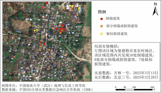 图2 缅甸曼德勒市建筑物受损情况遥感监测示意图