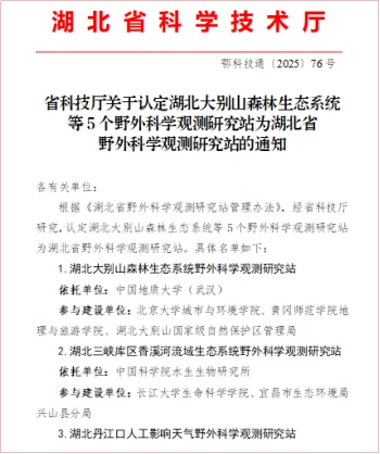 近日,湖北省科技厅下发了文件《关于认定湖北大别山森林生态系统等5个野外科学观测研究站为湖北省野外科学观测研究站的通知》(鄂科技通(2025)76号),公司建设的“湖北大别山森林生态系统野外科学观测研究站”获批2025年湖北省野外科学观测研究站。