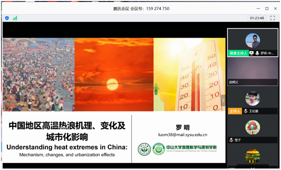 2020年4月22日下午,中山大学罗明副教授应邀通过公司在线授课平台进行了“中国地区高温热浪机理、变化及城市化影响 ”主题讲座,本次讲座由王伦澈副经理主持,180余名师生在线聆听了讲座。