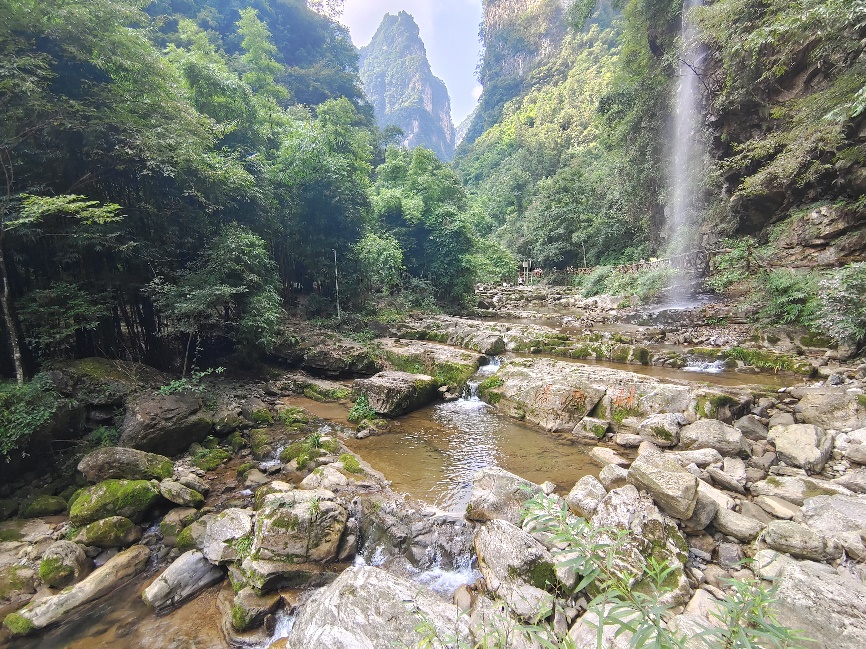 不同于完成其他路线时的烈日当头,竹海四面环山、清凉潮湿,空气中充满泥土的清新。上有白练凌空,下有溪流淙淙,宛若现实中的世外桃源、蓬莱仙境。晁怡老师介绍峡谷地貌是因四周山峰因河流作用、地壳抬升而形成,河谷分布有壶穴,在“河流下蚀”和“溯源侵蚀”两种力量的精心雕琢下,造就了三峡竹海的美景。
