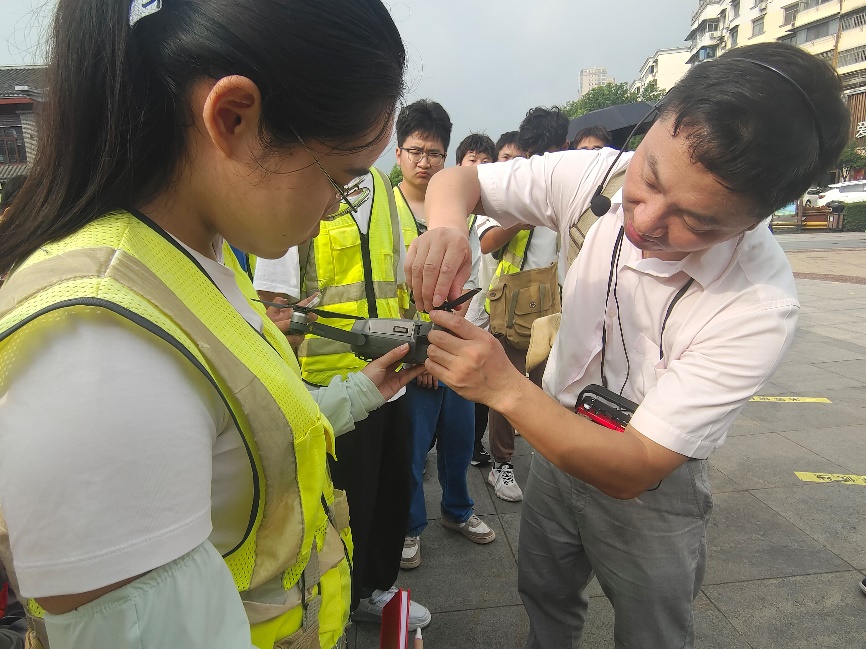 讲解后,张老师将遥控器交到员工手上,让员工动手体验操作无人机。经过张老师的讲解,同学们了解到无人机航摄精度可达0.2m,一般能够拍摄全色波段和可见光波段影像,安装相应传感器后也能够拍摄近红外、短波红外等波段影像,是遥感数据的一大来源。控制无人机环绕建筑进行侧视拍摄,能够使用软件构建出建筑的三维模型。无人机技术已然在民用和军用领域发挥着重要作用。这节生动的实践课吸引了同学们的注意力,充分调动了同学们学习无人机操作的积极性。