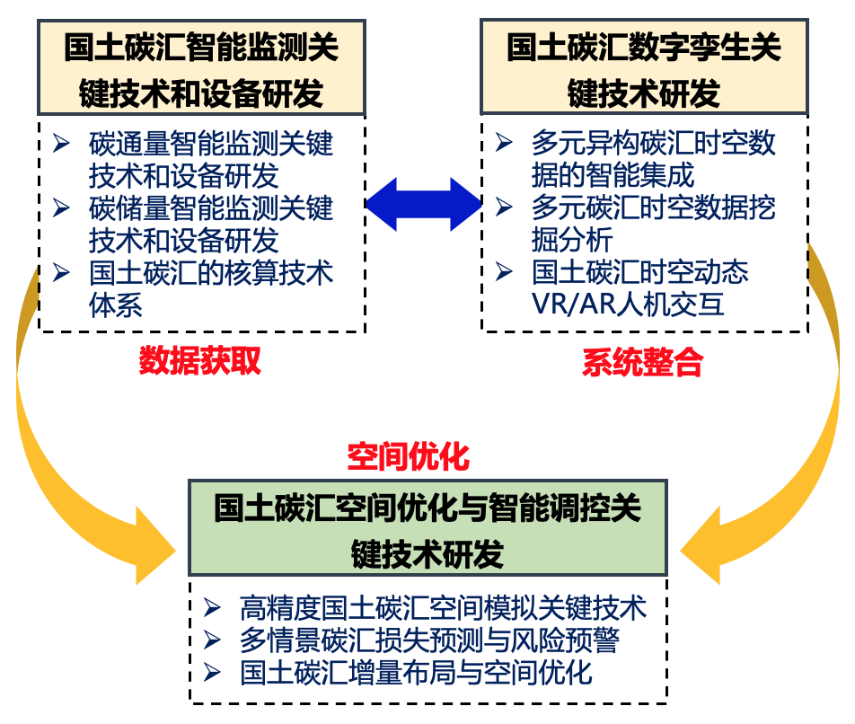 (3)国土碳汇空间优化与智能调控关键技术:优化以碳增汇为目标的国土空间综合整治与生态保护修复,为我国制定实现“双碳”目标的政策和路径给予有力的支持。