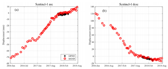 图2展示了黑方台党川滑坡群内GPS量测结果与InSAR量测结果的对比,显示出良好的一致性。GPS测量结果与升轨、降轨Sentinel-1 InSAR测量结果的差异平均值分别为1.4mm和1.0mm,相应的标准差分别为1.3mm和4.9mm。