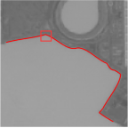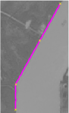 为了验证方法的有效性与适应性,基于高分二号上目视解译的参考海岸线,本文从landsat8 OLI图像中选择了5条具有不同海岸环境、不同形态、不同类型海岸线作为实验区域,算法提取的视觉效果如图1,对提取结果进行精度分析,结果如表1。其中,均方根误差(RMSE)范围为3.02米到4.77米;线匹配度(LM)范围从2.51米到3.72米,这说明本文算法对不同形态的海岸线具有一定的有效性和适用性,且具有稳定的亚像元定位精度。除此之外,本文通过比较亚像元海岸线提取结果与参考海岸线的长度,验证了算法对海岸线细节的保存性,结果如表2。