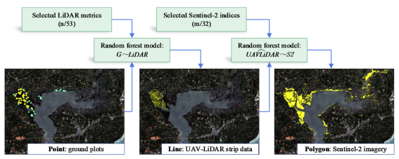 图2. 在局部尺度(清澜港省级自然保护区核心区),基于点-线-面框架,使用野外样方、无人机激光雷达条带数据和Sentinel-2影像构建G〜LiDAR〜S2尺度上推方法。