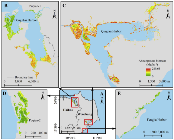 图4. 10米空间分辨率海南岛东北部红树林地表生物量图. B、东寨港国家级自然保护区,C、清澜港,D、铺前港,和E、冯家港。
