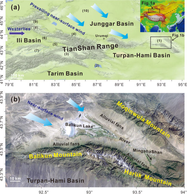 (A) Landscape of the current study region and locations of previous studies. The black dashed line shows the modern Asian summer monsoon limit (Chen et al., 2008). (1) Balikun Basin (An et al., 2012, 2013; Zhao et al., 2015, 2017), (2) Boston Lake (Huang et al., 2009), (3) Bayanbulak/Yourdusi Basin (Long et al., 2017; Huang et al., 2015), (4) LJW10 loess-paleosol section (Chen et al., 2016), (5) Yili River Valley (Chen et al., 2016), (6) Yili section (Li et al., 2011), (7) Kesang Cave (Cheng et al., 2012; Cai et al., 2017), (8) Sayram Lake (Jiang et al., 2013), (9) Aibi Lake (Wang et al., 2013), and (10) Manas Lake (Rhodes et al., 1996; Wei & Gasse, 1999). (B) Geomorphology of the intermountain Balikun Basin. Note that the only low-elevation landscape (~2,000 m) is present along the northwestern margin of the basin and forms a natural wind gap that enhances the prevailing near-surface wind intensity.