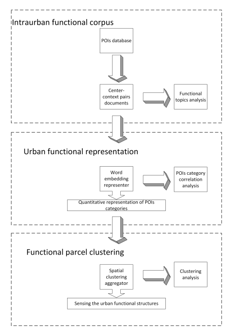 模型主要分为以下步骤:(1)构建城市功能语料库;(2)通过词向量技术构建高维度多义性词向量;(3)应用空间聚类方法进行聚类,识别城市功能区。