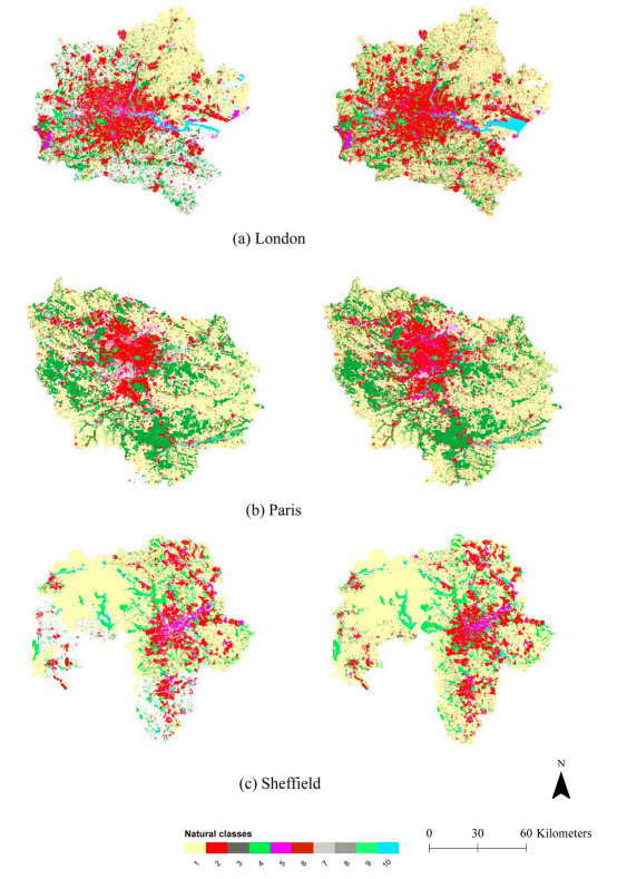 然而,OSM数据的属性类别多达500余种,如何将OSM数据自动转换成土地利用图仍是当前的研究难点。本研究提出了一种自动建立OSM与参考土地利用数据类别一致性的方法(如图1),主要包括三个步骤:(1)将OSM线状要素(如道路、铁路和水系等)通过缓冲区分析转换成面状要素;(2)对多个OSM面状要素根据面积大小依次合并;(3)基于聚类方法自动建立OSM与参考土地利用数据的类别映射关系,并对OSM数据的属性进行重分类。研究选取了欧洲多个实验区域验证了该方法的有效性(如图2和3);研究结果还证明:由任意实验区域自动建立的类别映射关系也适用于其它实验区域的土地利用制图。