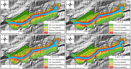 Figure 1. Landslide susceptibility maps obtained from (a) ANN model, (b) LR model, (c) SVM model and (d) CART model.