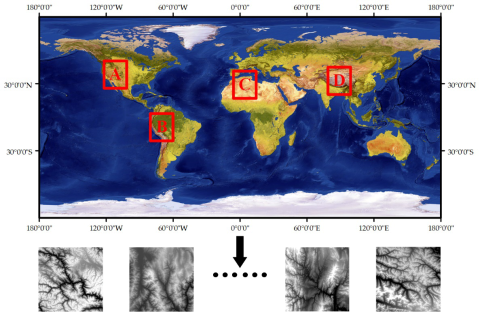 本项目在全球四个主要山脉分布区域选取DEM数据构建训练数据集(图2),通过蒙特卡洛随机裁剪的方式得到了70000幅尺寸为64x64的DEM数据,其中70%用于构建训练数据集,30%用于构建测试数据集。经过训练的地形生成模型实现输入含空洞的山区DEM数据,可以对无数据区域进行有效修复,重建地形纹理。从实验结果可以看出,与传统插值方法相比(图3-4),本项目基于深度网络构建地形纹理生成模型,能够处理较大空洞区域,重建自然的地形纹理。同时,基于地形纹理生成模型的处理结果能够用于地形特征提取等应用,与参考数据具有较好的一致性,因此能够提升DEM数据的有效性。