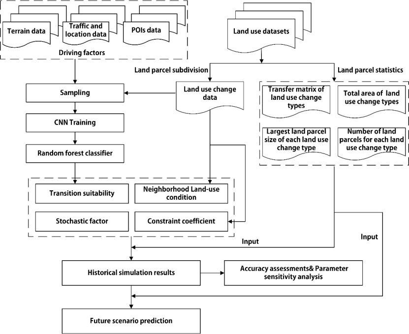 本研究提出一个耦合卷积神经网络和矢量元胞自动机的土地利用变化模拟模型框架——CNN-VCA模型。该模型以地籍地块为基本元胞单元,利用卷积神经网络提取不规则地块周边邻域内驱动因子的复杂特征,并挖掘邻域尺度下驱动力因素对地块转换适宜性的影响。本研究框架结构如图1所示: