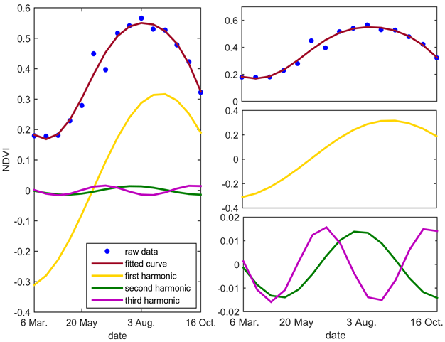 时间序列遥感数据对于反映作物的生长进程(物候),提高作物识别精度有着重要意义。然而时序数据会受到多种来源的噪声影响,并且大范围、全覆盖农作物分布一张图制作过程中庞大的数据规模和计算量,给处理平台带来了巨大的压力。同时多种传感器数据之间的数据类型和定标差异也限制了多源时序数据的应用。谐波分析方法的基本原理是通过将时间序列曲线分解为若干余弦曲线叠加对其进行拟合,一方面可以恢复原始序列的特征,另一方面消除了阴雨天气、阴影等噪声对时间序列的影响。在此基础上,本研究使用谐波分析分解多源遥感时间序列数据,利用分解后获得的傅里叶系数,重新计算能够概括原始时间序列特征的特征参数,以较少的特征参数反映作物的生长变化特征。使用MOD13Q1植被指数产品计算物候特征,使用Sentinel-1的后向散射系数产品提取后向散射特征,并结合Landsat-8 OLI和Sentinel-2数据所反映的光谱特征,构建多源遥感特征集。基于Jeffries-Matusita(J-M)距离的可分离性分析检验显示该方法构建的特征集具有很好的可分析性,J-M距离高于1.99。