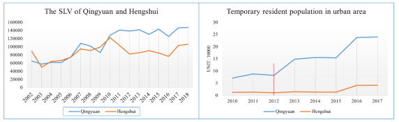 Fig.5. Comparison for the economic development of cities along and not along the BGHSR line: Qingyuan and Hengshui.