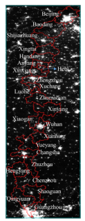 Fig.1. Cities along with Beijing-Guangzhou high-speed railway (BGHSR) (a) and the associated Night-Time Light (NTL) imagery (b).