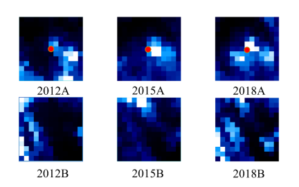Fig.4. Comparison of the economic development around (A) and far away (B) from Zhengzhou East HSR Station in the years of 2012, 2015 and 2018.