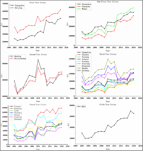 由于区域城市等级和空间分布模式是中国城市群经济作用的关键内容,因此我们根据城市等级分类对数据的SLV值进行分析(Fig. 2)。可以看出,高铁对城市的影响因城市等级而异。具体上,高铁建设促进一线城市和新一线城市的经济增长,同时也会导致部分二三线城市的经济衰退。这在一定程度上也证实了高铁会加剧“大都市效应”。