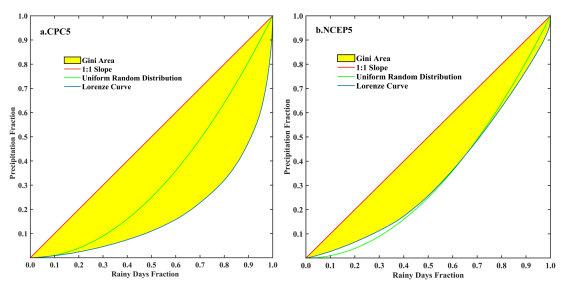 图2. 1980-2017年间中亚日降水的Lorenz曲线(左图CPC降水;右图为NCEP降水)