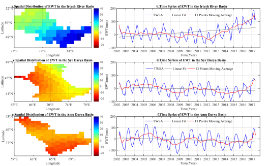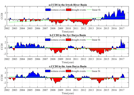 在前人的研究中虽然已经提出了有很多干旱指数(SPI,SPEI,PDSI,TSDI等等),但是它们多是只能反应陆-气系统中比较单一的水分赤字情况,很少能同时综合反映多种水分组份赤字的指数。然而,GRACE重力卫星为同时监测陆地系统地表水、土壤水、地下水、雪水当量及植被冠层水总和的变化提供了重要技术手段。而中亚地处欧亚大陆中心,很少受到大气环流的影响,气候干燥,生态环境脆弱,极易受到干旱的影响。本项研究就是通过GRACE重力卫星的陆地水储量数据和降水数据,做标准化处理耦合成为一种干旱指数(CCDI),来研究中亚近年来的干旱情况。
