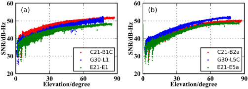 图2. KNDY测站兼容互操作频点信噪比随高度角变化情况对比