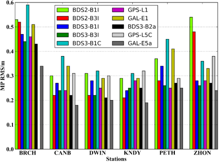 图3. 每个测站的每一频点多路径的RMS统计