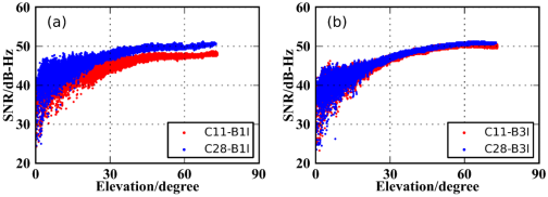 图1. ZHON测站C11和C28卫星B1I和B3I频点信噪比随高度角变化情况