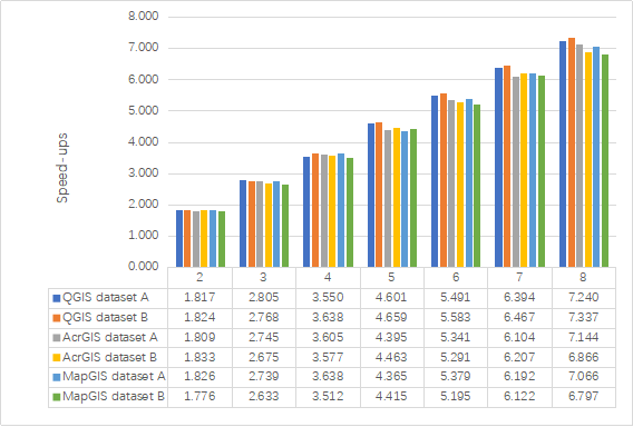 图2 分别使用2- 8个线程在QGIS, AcrGIS和MapGIS平台上的加速比