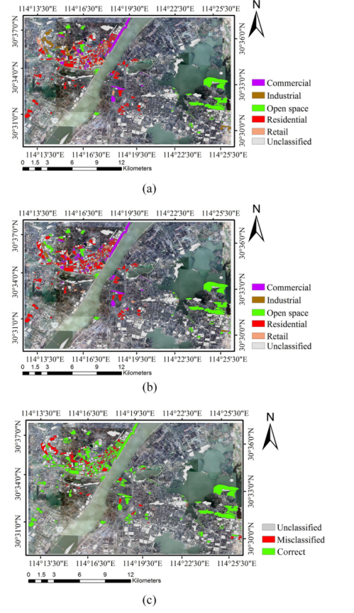 Figure 11. Land-use classification maps. (a) ground truth map and (b) predicted map, where different colors represent different land-use types, (c) misclassified land parcels.