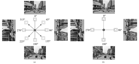 Figure 4. Eight-direction (a) and four-direction (b) displacement strategies. The solid circles represent the shooting position of the image, and the dash circles represent the target positions to move to. The dash boxes represent the movement of the SVI at the intersection, and the solid boxes represent the movement of the SVI on a single road.