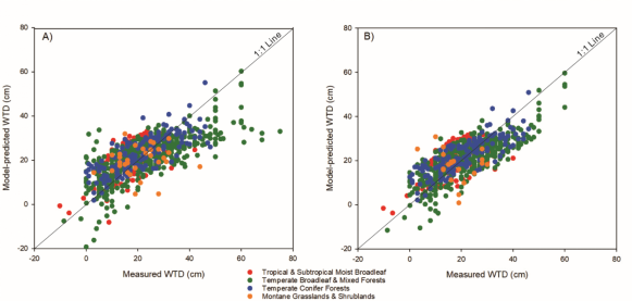 图2 亚洲地区泥炭地微型生物属种与水位的转换函数模型,横坐标代表实际观测的水位值,纵坐标代表模型预测的水位值,A为全部样品的回归结果,B为筛选去除异常样品后的回归结果