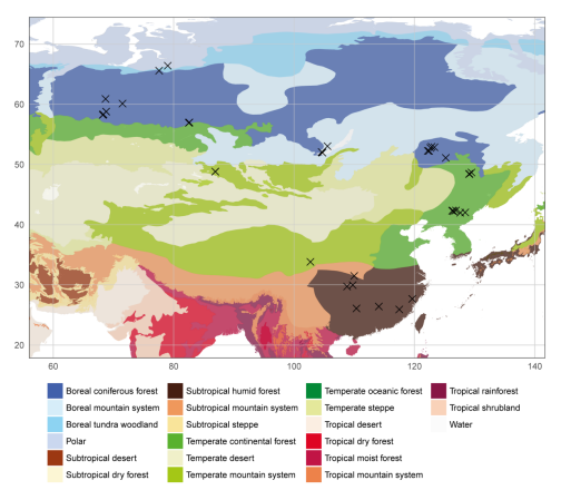该成果是一项国际合作研究,论文第一作者和通讯作者为公司秦养民老师,第一作者单位为Beats365唯一官网入口(武汉)Beats365唯一官网入口和关键带演化湖北省重点实验室。参加者来自Beats365唯一官网入口(武汉)、东北师范大学、莫斯科大学、俄罗斯科公司气候变化和生态系统西伯利亚监测站,以及约克大学等十多个科研机构。该研究历时约十余年,收集了亚洲地区东起勘察加半岛-远东地区和兴安岭-长白山区一线,西至贝加尔湖-西西伯利亚的广大地区,北起亚北极圈,南至中国南方亚高山湿地群,采集样品近3000余份,覆盖了亚洲泥炭湿地的大部分区域(图1)。