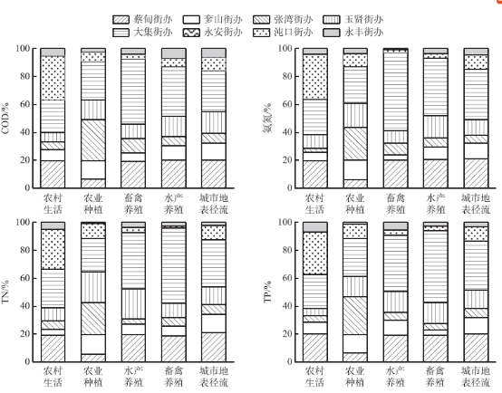 如图5所示,在后官湖周边8个街办中,COD、氨氮和总氮的主要来源是城市地表径流,对城市地表径流的贡献中,三者都表现出相同的规律,比重最大的是大集街办,其次为蔡甸街办,二者占比超过了50%。氨氮的第二大污染源为农业种植,张湾街办所占比例最大,其次为大集街办。总磷的主要来源为农业种植,以张湾街办和大集街办所占的比例最大,二者所占比例在23%以上,其次为玉贤街办总氮。第二大污染源为水产养殖,以大集街办所占比例最大不同街办所占不同类型污染源的贡献表明,开展后官湖面源的治理中,针对COD、氨氮、总磷、总氨应该采取不同的策略,分别以不同的街办为重点进行治理和防控。