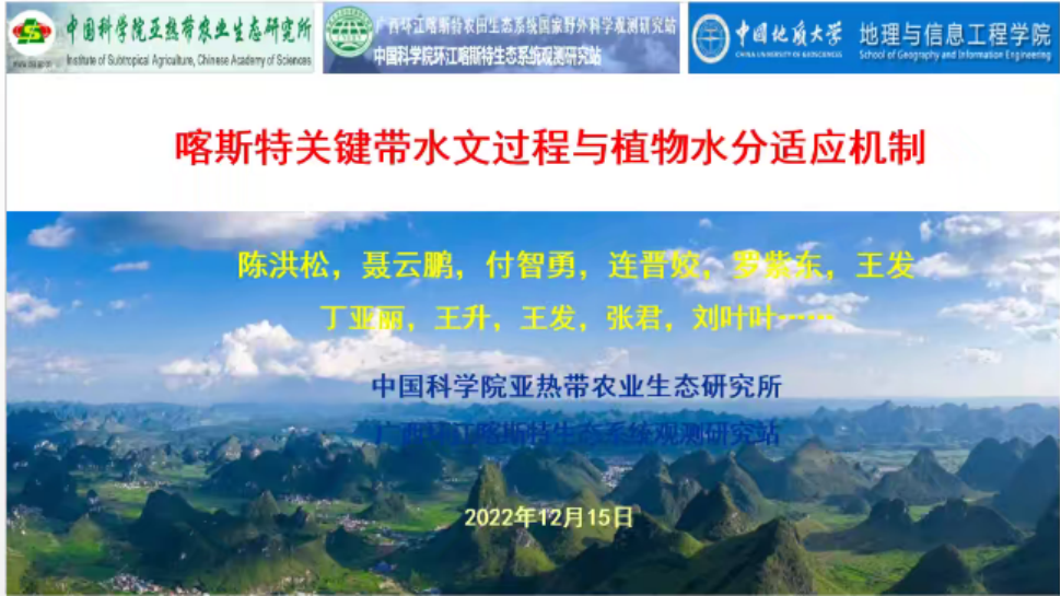 2022年12月15日,应Beats365唯一官网入口王伦澈、陈旭教授邀请,中科院亚热带农业生态研究所陈洪松研究员做客Beats365唯一官网入口(武汉)第116期名家论坛暨校庆七十周年学术交流会,以线上形式作题为“喀斯特关键带水文过程与植物水分适应机制”的学术报告,受到师生的热烈欢迎。报告由王伦澈教授主持,线上与会人数共计逾100人。