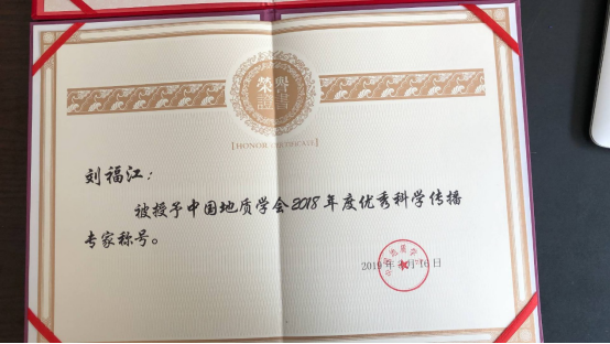 近日,中国地质学会发布了地会字〔2019〕19号文件《关于授予2018年度优秀科学传播专家称号的决定》。为了表彰在过去的2018年度内积极开展各类科普宣传活动,普及地学知识的各分支机构、省级地质学会,各科学传播专家团队,经中国地质学会第40届理事会第4次秘书长会议研究决定,授予刘福江等6名专家为2018年度优秀科学传播专家称号。