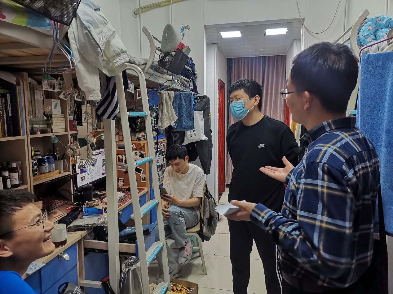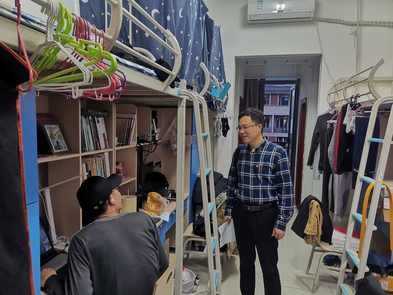 晚7点,武彦斌带队分别队男女生宿舍进行安全文明联检,向员工表达节日问候,并提醒同学们相关安全事项。晚9点,检查结束。