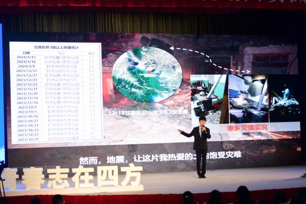 决赛现场,张鹏以《为大地“把脉”,向地球“听诊”,做地震安全“守夜人”》为题,从西部地区地震灾情引入,生动讲述了自己“在灾难中磨砺,在希望中前行”的成长故事,表达了对于地震监测系统的建设憧憬以及立志成为一名地震局地震监测预警人员的梦想,展现了地大学子积极向上的良好精神风貌。