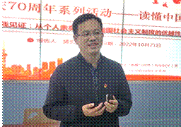 盛宏模老师做讲座。他主要从今昔对比和中美对比两个方面出发论证了社会主义制度的优越性。从鸦片战争伊始到新中国成立,再到改革开放以来新中国翻天覆地的变化,他结合个人经历为我们讲述了中国共产党在中国民族在近代以来的领导作用,从他讲述的内容中,大家能更好的理解到“中国共产党为什么能”、“中国特色社会主义为什么好”、“马克思主义为什么行”,更加坚定了中国特色社会主义的制度自信。